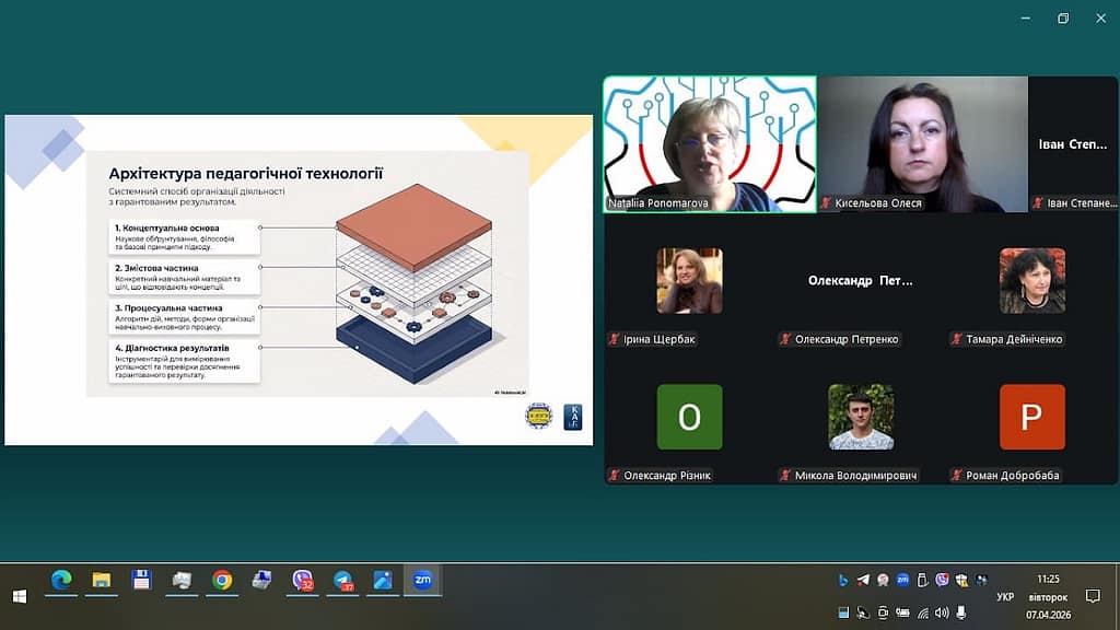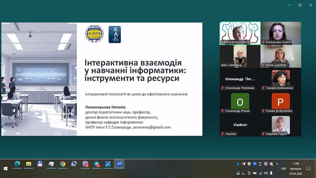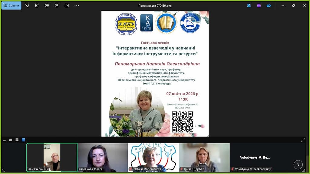 07 квітня 2026 року Пономарьова Наталія Олександрівна, доктор педагогічних наук, професор, декан фізико-математичного факультету, професор кафедри інформатики провела гостьову лекцію у рамках Весняного методичного марафону “Досвід навчання інформатики у сучасних умовах” на кафедрі інформатики КЗ “Харківська гуманітарно-педагогічна академія”.