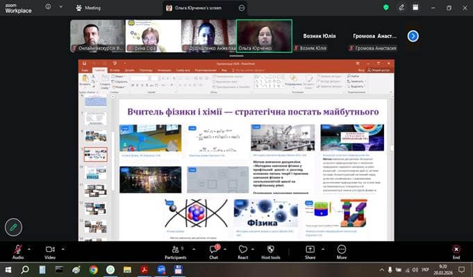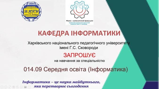 20 березня 2026 р. відбулася онлайн-екскурсія на фізико-математичному факультеті ХНПУ імені Г.С.Сковороди для учнів 10-В класу Харківського ліцею 107 за участю координатора з наукової роботи доцента Гайдуся А.Ю.. Спікери від кафедри математики, інформатики, фізики і хімії (доц. Сіра І.Т., доц. Гайдусь А.Ю., ст. викл. Юрченко О.В.) розповіли учням про університет та факультет, про особливості освітніх програм, про кадровий склад кафедр, про організацію навчання та переспективи працевлаштування здобувачів освіти.