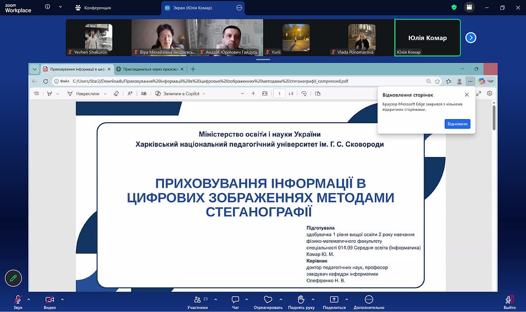 1 місце — Комар Юлія, тема: «Приховування інформації в цифрових зображеннях методами стеганографії», науковий керівник: д.п.н, проф. кафедри інформатики Олефіренко Н. В.;